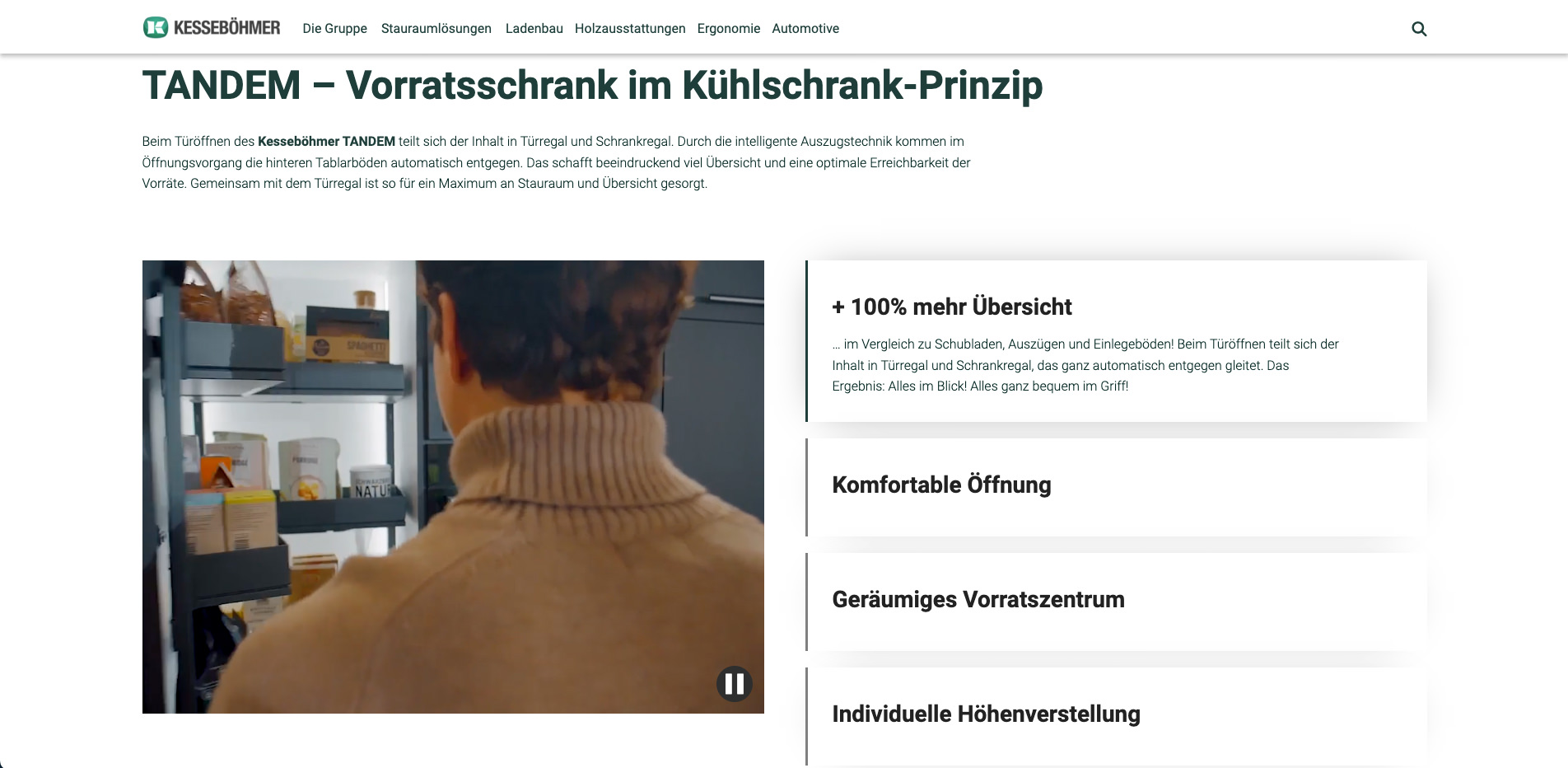 Relaunch des zentralen Marken- und Produktauftritts von Kesseböhmer: eine modulare, international skalierbare Website mit klaren Einstiegen für Endkund:innen, Handel/Industrie und Bewerber:innen – inkl. Produkt-/Anwendungswelten, Content-Hub, Lead-/Kontaktstrecken sowie eigens entwickelte UI-Komponenten (u. a. eine eigenständige Händlersuche mit individuellen Features).